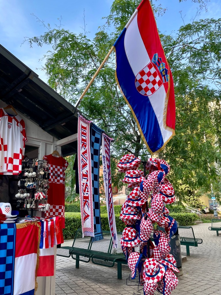 Besonders nah am Feuer gebaut sind da bekanntermaßen die Fans Kroatiens. Und so war das Spiel gegen Albanien in allen Belangen ein Ritt auf der Rasierklinge. Drama, Baby. Denn als Zeitzeugin sah ich schon morgens vor allem Rot-Weiß und vor lauter Modric‘ den Trikot-Wald nicht mehr. Jeder Mensch, jedes Auto, jeder Hund trug rot-weißes Schachbrett. Um 15 Uhr dann ging es endlich los. Während einige noch herumirrten und ihren Platz suchten, nach 11 Minuten der erste Schock: 0:1-Rückstand in einem so wichtigen Spiel (beim ersten Gruppenspiel gegen Spanien musste man ja erstaunlich klein beigeben). Betretenes Schweigen. Dann wortreiche Beschwerden, die ich mit quasi null Kroatisch-Kenntnissen nur übersetzen konnte als: Was denn hier los?! Das darf doch nicht wahr sein, verdammt noch mal! Es war wahr und einen höheren Rückstand zur Pause vereitelte einzig der kroatische Torwart. Unzufriedene Gesichter. Aus der Pause dann kam man besser, bis zum erlösenden 1:1 dauerte es aber eine zähe halbe Stunde. Egal! Bengalos brannten, die erste Bierdusche klebte im Haar. Zwei Minuten später das 2:1. Und wie heißt es doch so schön: Ein Bier am Rücken kann auch entzücken. Kollektive Erleichterung, man brachte sich euphorisiert in abschließende Siegerjubelposition. Doch dann, in der fünften Minute der Nachspielzeit: Der späte Ausgleich. Resignierendes Gestöhne. Dann Stille. Vereinzelte Flüche, aber auch dafür fehlte irgendwie die Kraft. Immerhin hatte man knapp zwei Stunden in der prallen Mittagssonne ausgeharrt, denn auf einem erbarmungslos schattenlosen Platz stand die große Leinwand. Der Schweiß stand vielen im Gesicht, keine Tränen. Natürlich nicht! Denn: „Noch ist nichts verloren!“, rief man sich zu. Soweit ich verstand.